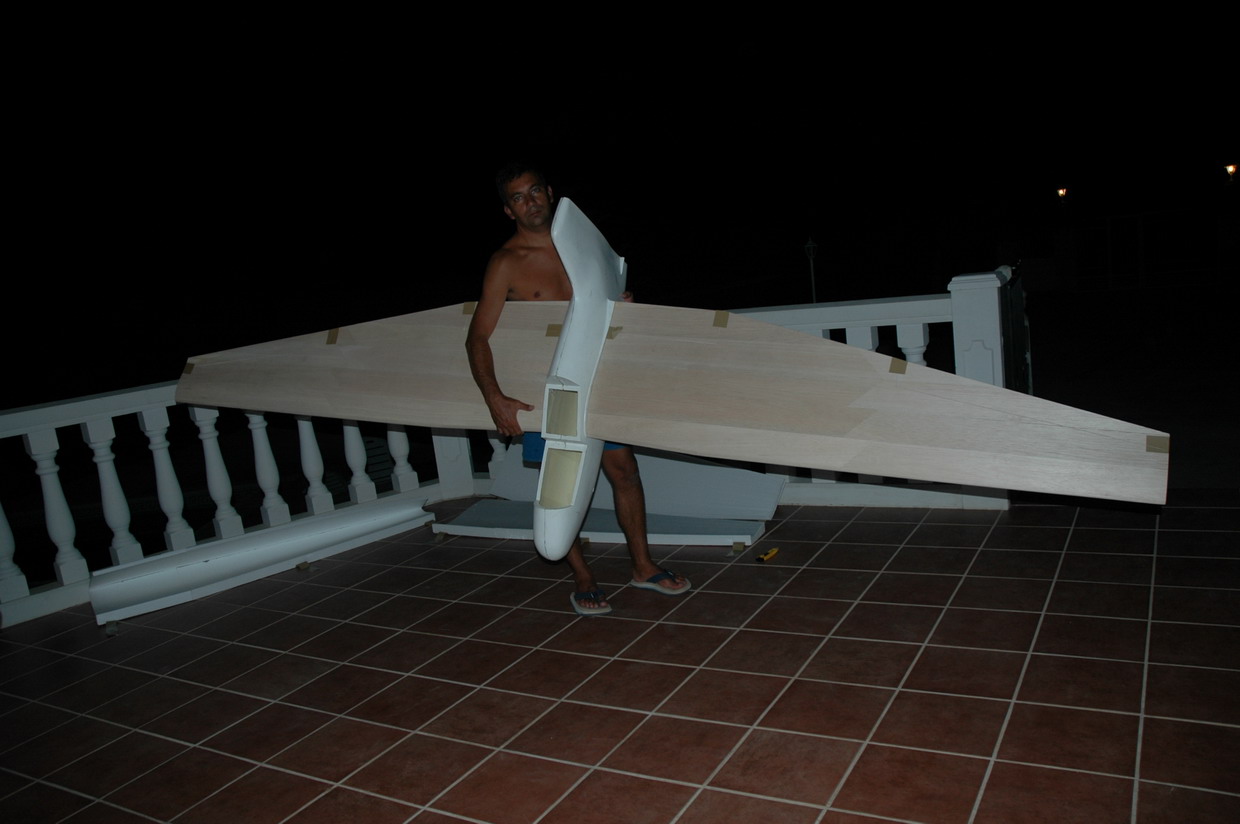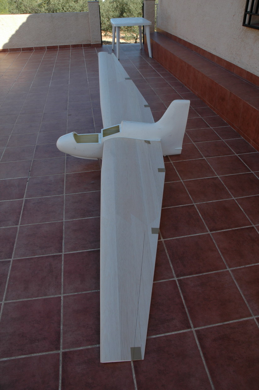 Despues de 40 días de espera me llegó un paquete de grandes dimensiones, ni bien verlo me di cuenta que algo faltaba! Eran solo las alas, ni rastro del fuselaje y accesorios! Eché un vistazo a las alas y la verdad en que estan muy bien fabricadas, una maravilla con una cuerda de 50 cms.Trae los cables de los servos pasados perooooo... no trae los aerofrenos por lo que tengo que comprarlos. Luego empezó la peregrinación por saber que había pasado con el fuselaje (yo estaba de vacaciones, mi amiga tambien, los mail en spaninglish y germaninglish iban y venían pero por fin apareció.