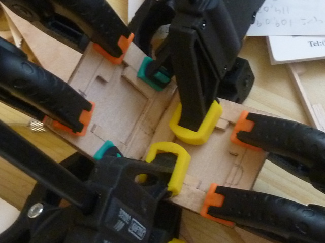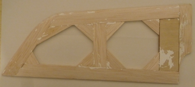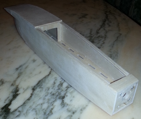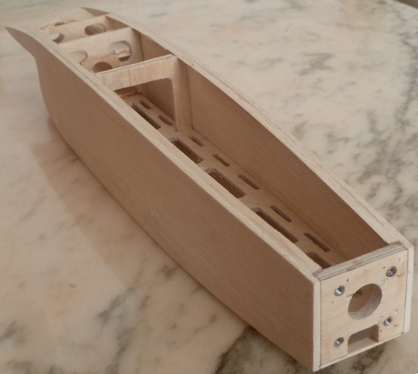 Las tres últimas cuadernas, que soportarán el tubo de carbono, son de contrachapado de 3mm, al igual que la plataforma horizontal para fijar la electrónica. La parallamas es de contrachapado de 5mm y las demás son de balsa de 3mm. El resto es todo balsa de 3mm excepto los listones triangulares de 5mm que refuerzan la unión de los enchapados y ayudan a redondear las aristas.