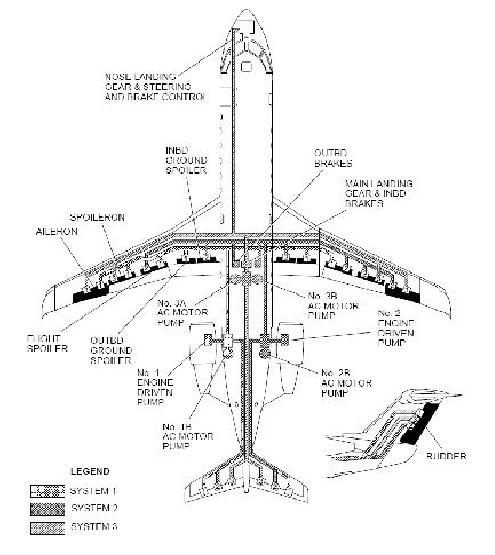 Los tres sistemas accionan todos los mandos de vuelo, ya que si fallan dos sistemas, muy difícil todo sea dicho de paso, el sistema restante se haría cargo de los mandos de vuelo. Peeeeero, los sistemas 2 y 3 solo accionan los frenos y, el nº3 solo acciona el tren de aterrizaje.