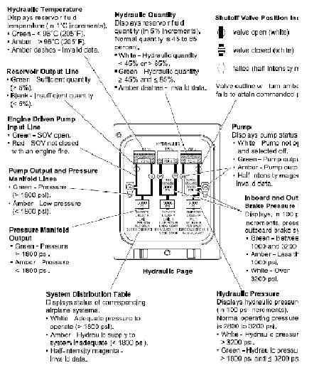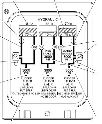 Os dejo un par de dibujos que representan la distribución y la página sinóptica del EICAS en la que nos aparece la información del sistema hidráulico.