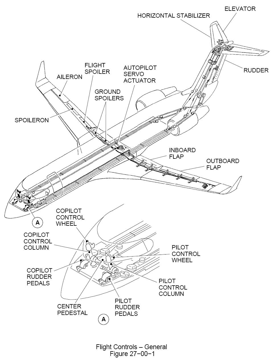 Por último y, como no podía ser de otra manera, os dejo el esquema de los mandos de vuelo. Los mandos de vuelo en el CRJ están pilotados por cables y poleas, pero actuados hidráulicamente. Cuando movemos la palanca de mando, movemos las válvulas del sistema hidráulico que dejan pasar el fluído por las líneas de presión en un sentido o en otro. No movemos directamente las superficies de mando. No confundir.