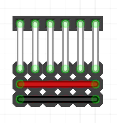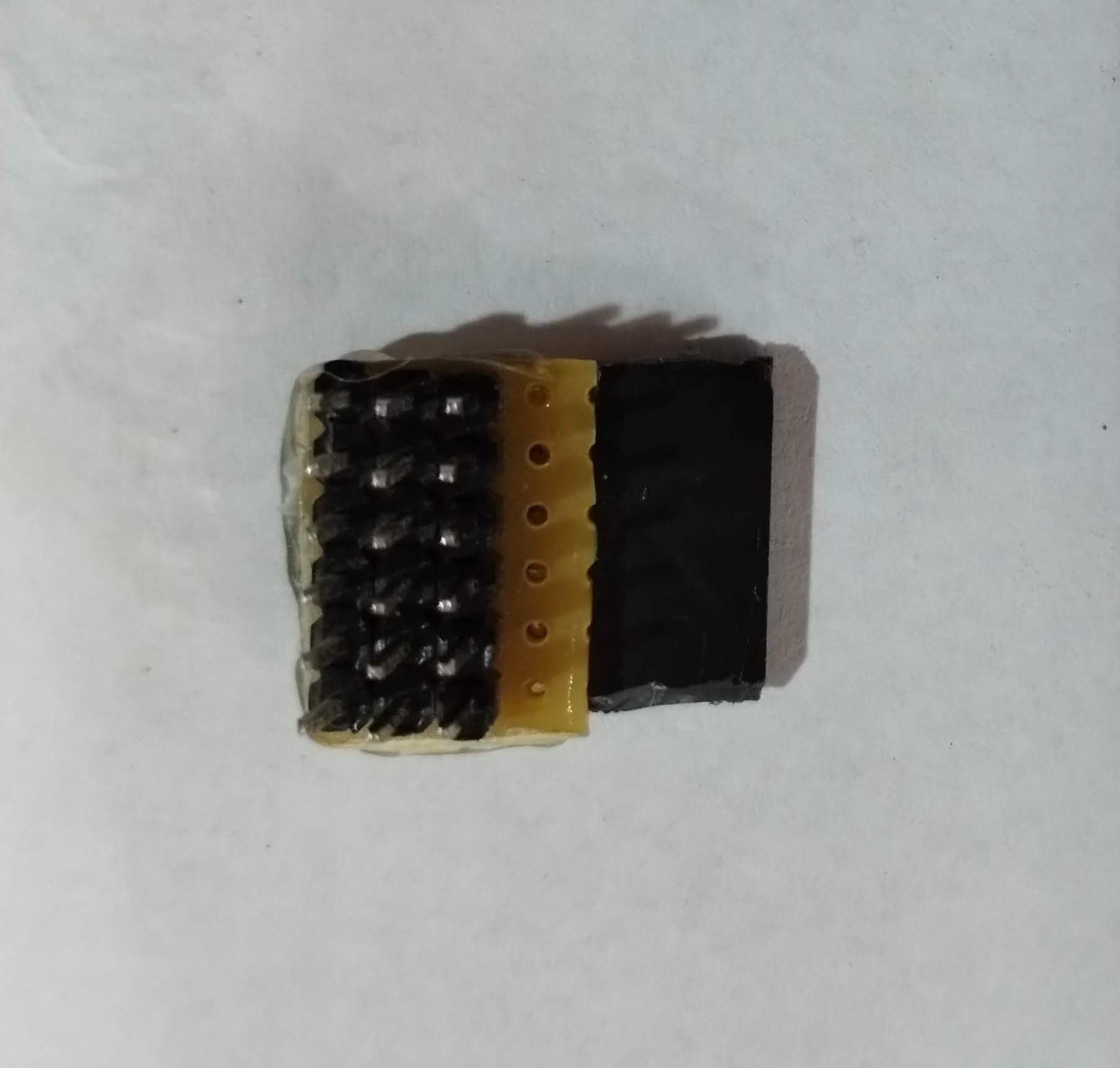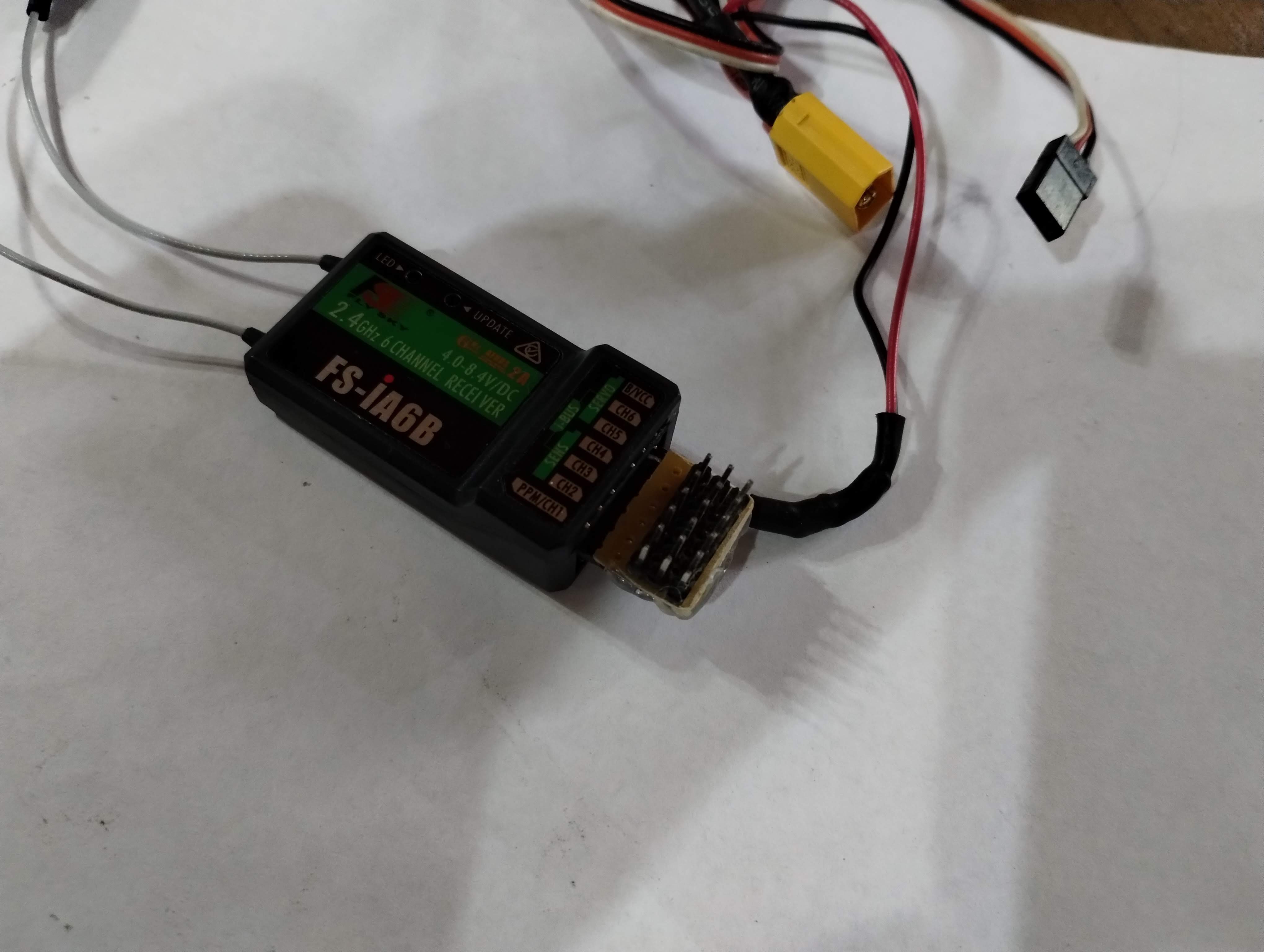 Hice un adaptador con 6 pines hembra (Como los de los servos), y 18 pines macho (Alineados como están en el receptor). Los 6 pines de arriba se conectan cada uno de los 6 canales de los pines hembra, los 6 pines del medio están interconectados (positivo) y por otro lado interconecte los 6 pines de abajo (negativo).