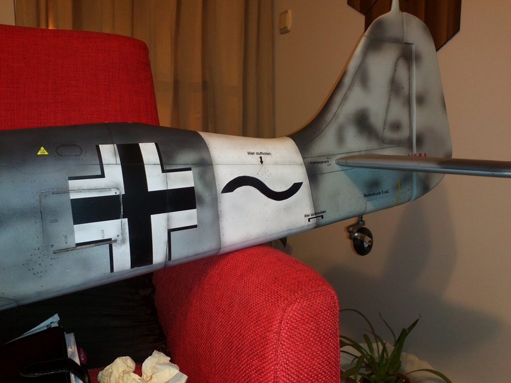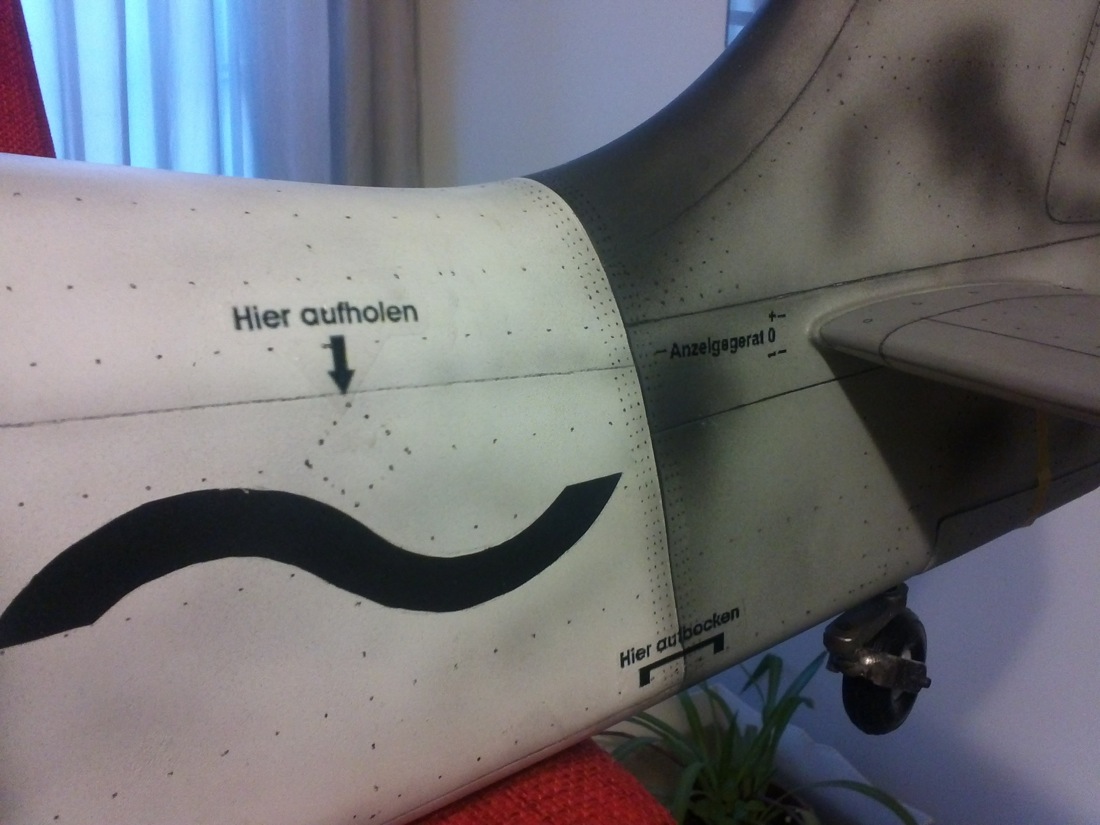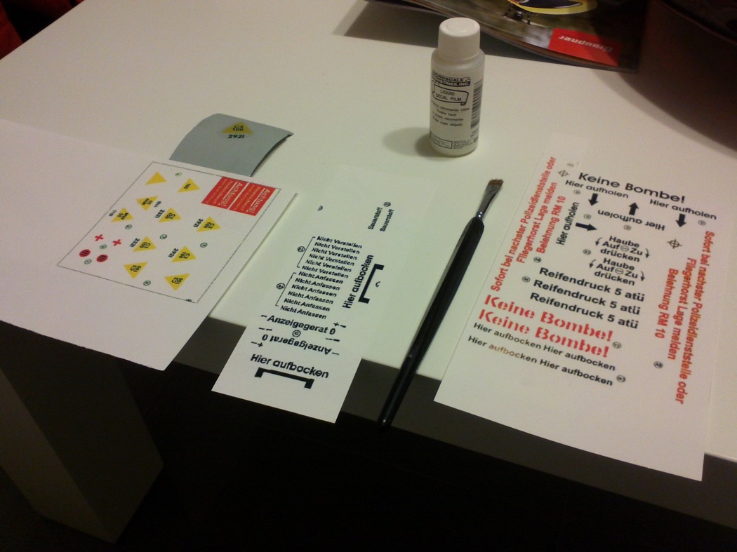Pues me he puesto a colocar las calcas del fuselaje y casi las dejé todas puestas. Para ponerlas tube que ayudarme humedeciendo las superficies donde tenía que colocarlas con microset. Este papel tiene un poco de tendencia, una vez colocada la calca, a rizarse conforme seca. Como no conocía otro medio para evitarlo, puesto que en las calcas que vienen ya impresas no acusan ese problema, ablandé la calca dandole microsol con un pincel fino encima y peinando los cantos poco a poco y parece que se solucionó el problema. En cuanto pueda creo que tendría que darle encima una capa fina de algún barniz antes de darle laca a todo el fuselaje. Os pongo unas fotos de como va quedando el proceso.