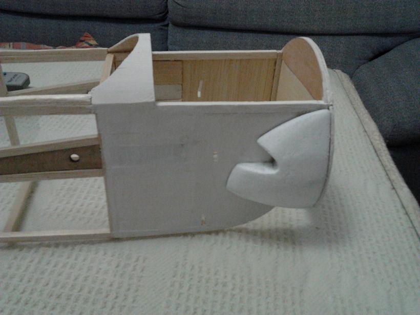 Otra cosa que adelanté que no sabía como hacerla son unos "abultamientos" que hay en los laterales detrás de la carena. Pensé en hacerlo por capas de balsa y luego lijar, pero al final he optado por coger dos bloques de foam y midiendo como buenamente pude en 3d :mrgreen: pues entre el cuter, la sierra y la lija asi ha quedado :mrgreen: