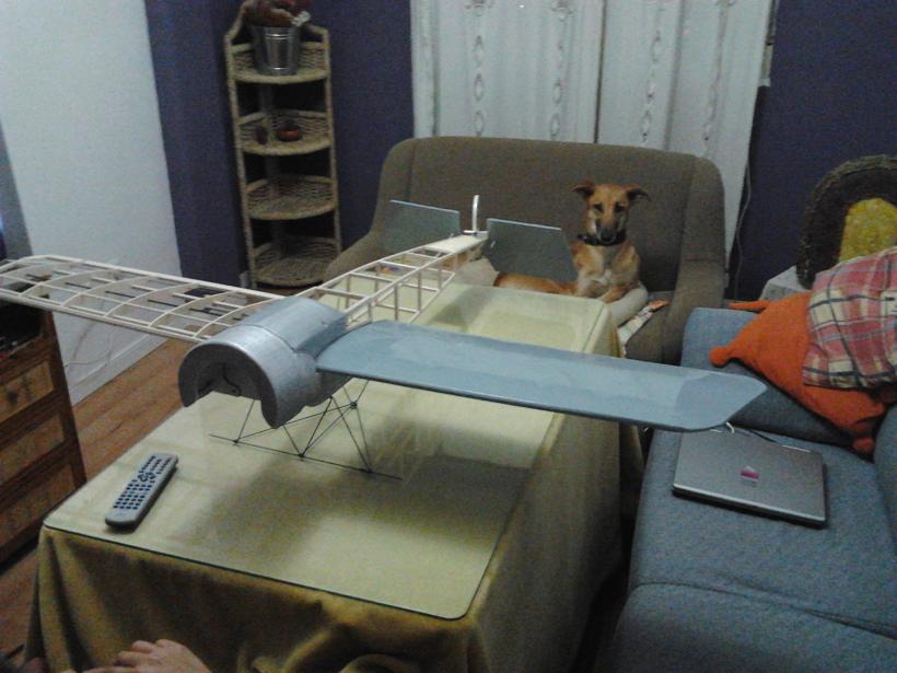Aquí se puede ver el tamaño del cacharrito y el dihedro que tiene (aparte del espectador galguno).