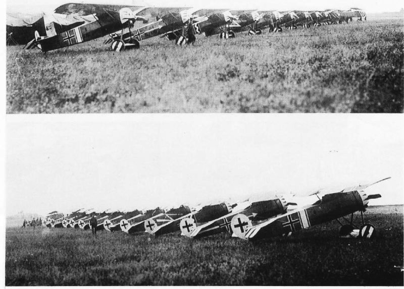 Ahí va una foto (sacada del Windsock nº 25) de la Jasta 6 con 12 o más de esos bonitos bichos alineados. El que me ocupa es el 4º hacia la derecha.