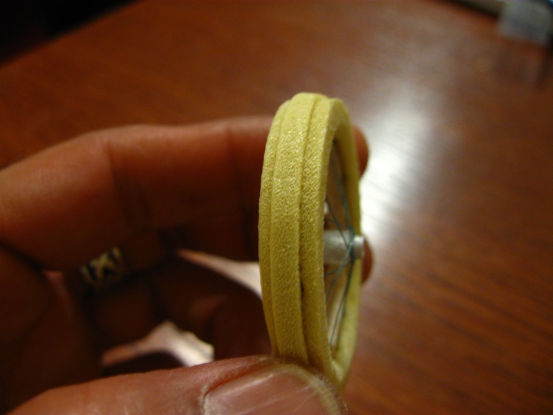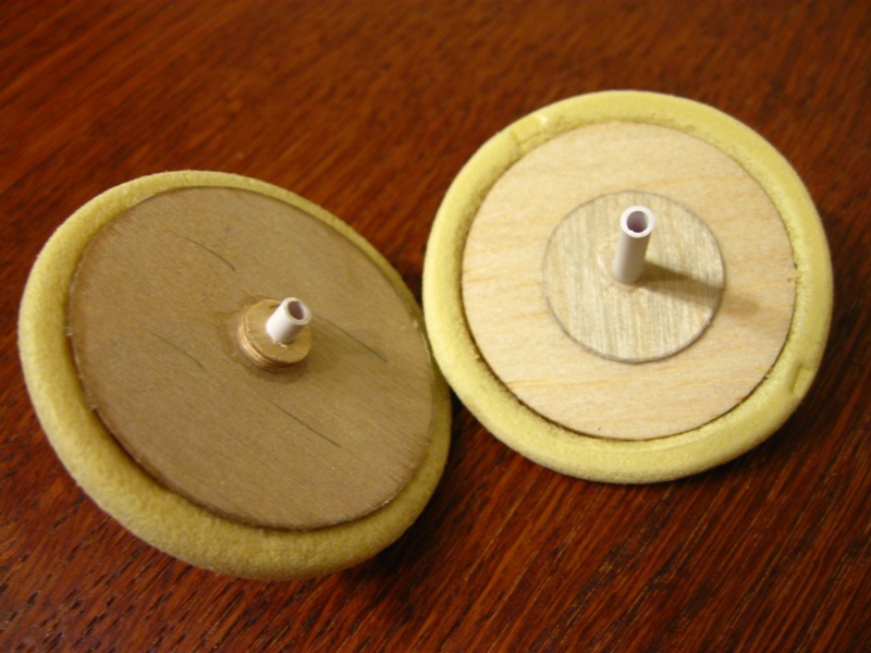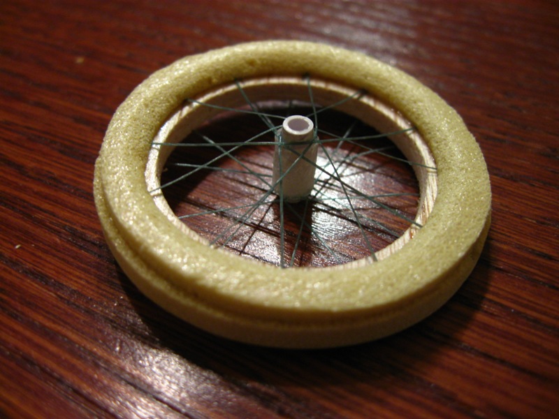 Para hacer las ruedas he hecho un círculo de balsa ligera de 3 mm; el neumático es de espuma de poliuretano bastante ligera; pero para reforzar he colocado un disco grande (por fuera) y otro pequeño (por dentro) de contrachapado de 0,6 mm. He tenido problemas en otras ocasiones con roturas de la madera alrededor del eje, por lo que el contrachapado es para limitar esa posibilidad y que se distribuyan mejor los esfuerzos.