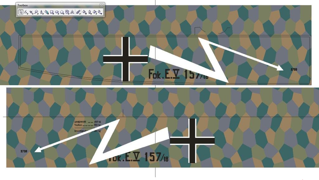 Además del lozenge, como el EV que voy a replicar (el 157/18 de teniente ¿Rolff? de la Jasta 6) estaba decorado con la marca personal del piloto (un rayo blanco) y llevaba el resto de la decoración de estos modelos (cruz balcánica adecuada a la época, tipos fokker en la matrícula, numeración del modelo, tabla de pesos en el lado derecho del fuse...) he hecho una composición con todo usando el AutoCad, el Corel y unas cuantas horas de trabajo.