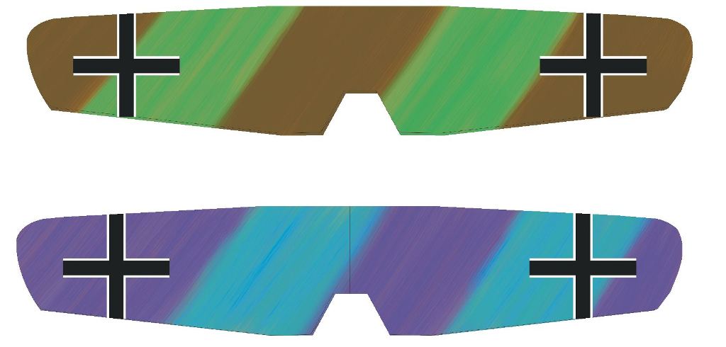 Por lo visto, según las últimas hipótesis (podéis mirar en Google “fokker EV” + “streaking” y ver resultados, especialmente en The Aerodrome) esos colores se aplicaban sobre el ala en bandas, no de una forma muy uniforme ni con unas líneas de separación muy netas, diagonalmente dispuestas con respecto a la envergadura, con varios patrones diferentes y alternando los colores: moca/verde arriba y violeta/azul abajo. El moca coincidiría con el violeta con el Borde de Ataque y el verde con el azul.