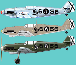 - Una con denominación GRÜNGRAU (gris verde) FS.36307 y muy próxima al RLM 02 con el que se pintaban todas las zonas internas de los 109(aunque a partir de los 109F la cabina ya no tenía ese color) y como camuflaje en las primeras versiones de los 109E alemanes. El RLM63 también se usó formando parte de algún camuflaje splinter en los 109 de la ¿JG54? en Rusia.