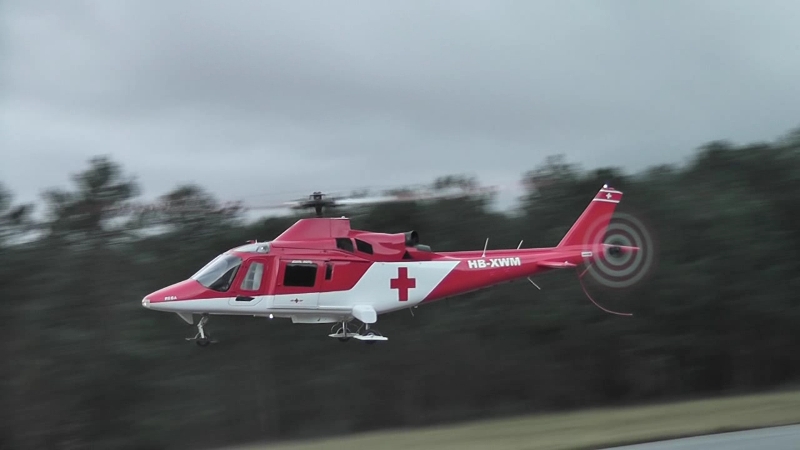 Es una maqueta de un helicoptero de rescate suizo, el Agusta 109K2 de la empresa REGA de rescates y ambulancia: