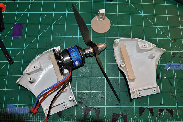Y el motor.. lo volvere a poner como estaba, pero pegado con epoxi, y tal vez super glue, es decir doble reforzamiento, y asi podre poner la 9X6, que si lo pongo como en las fotos de arriba, con los tacos de contrachapado.. pegaria la 9X6 en el fuse.. xD
