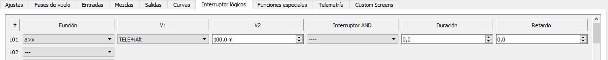 Lo primero que hice fue crear un “interruptor lógico” por ejemplo L01, asignar la función a>x, primer valor el canal de telemetría “Alt” y el segundo valor el intervalo “100.0m”.