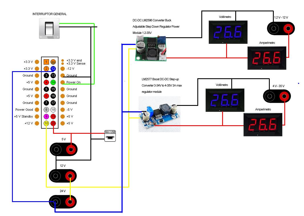 Partiendo de la fuente de alimentación ATX me he hecho este esquemilla. ¿Qué os parece? ¿Estoy metiendo la gamba en algún lado? En estos mundos de la electrícidad no es que sea ningún experto ni mucho menos...jeje