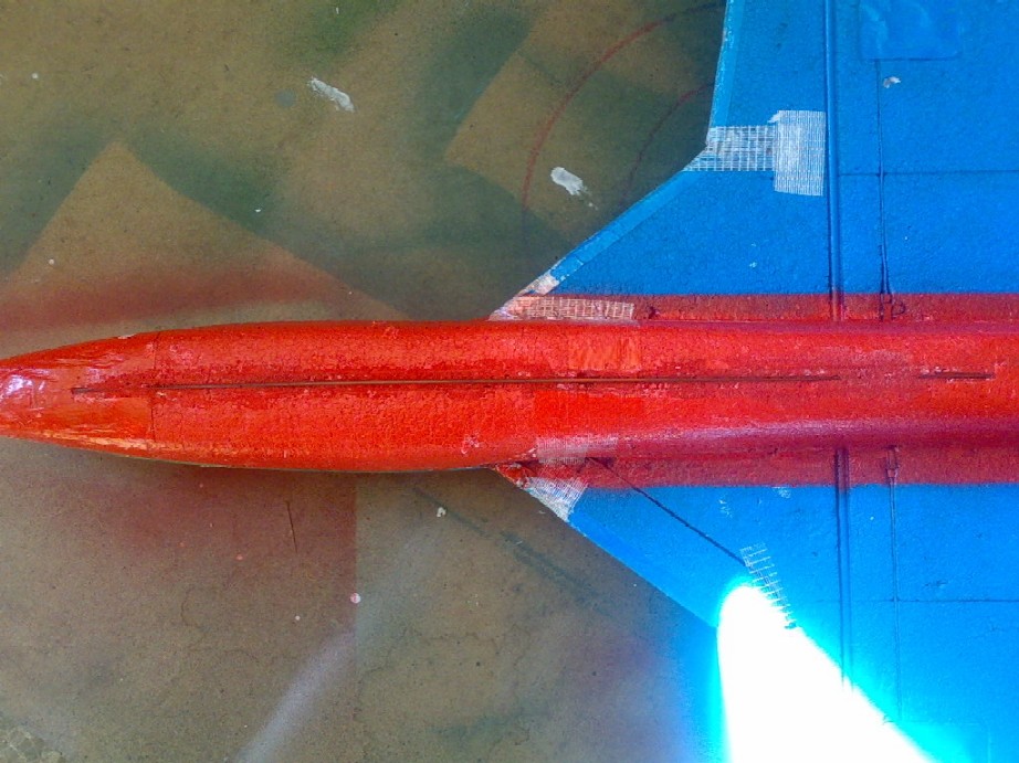 Además un lanzamiento infructuoso con mucho viento dió con el bicho en el suelo y roto el morro he decidido reforzarla con una barrita de 3mm de carbono por los bajos haciendo un rebaje con un soldador y fijándola con espuma de poliuretano, lijando al secado y pintando de nuevo, el resultado es mucho más firme ante porrazos de poca importancia evitando desintegraciones totales y el resultado en foto