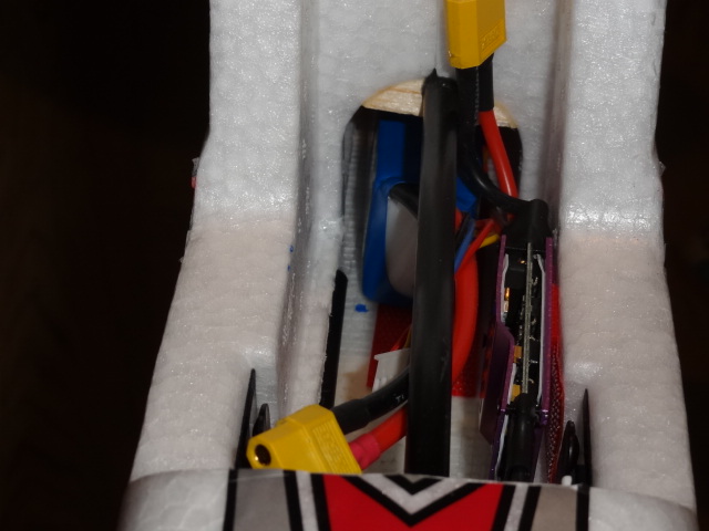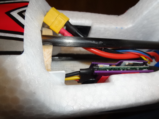 Lleva motor 35.30, variador de 40 A y batería de 2.200 mAh, ademas de los correspondientes servos metálicos en alerones, profundidad y timón y de nylon en flaps, que por cierto hemos tenido que invertir el giro en uno cambiando de posición los cables del motor y potenciometro.