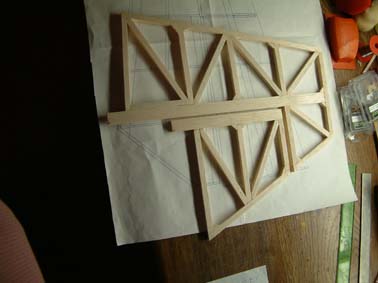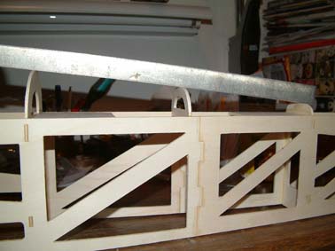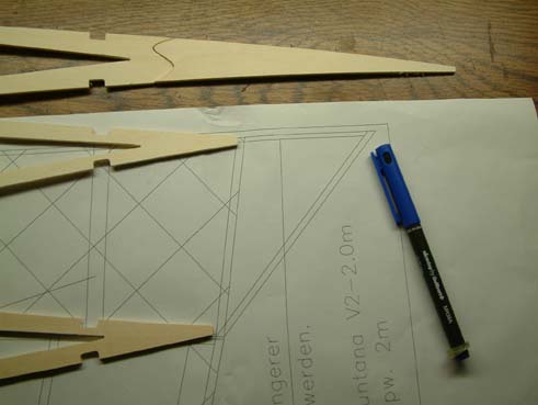 Otras dos piezas que deberían llevar colocación son las dos cuadernas que se usan para la parte posterior de la cabina que van a ‘puro huevo’ y la que da la inclinación de la cabina, también incluye el ‘puro huevo’ para la inclinación. Para que el huevo no fuese el de Colon, con una regla puse la más pequeña, que va entre dos ya fijas de tal forma que quedase en ¿su sitio? estando la regla tangente a las tres. El mismo procedimiento lo he empleado para la que va inclinada. La he colocado donde más o menos señala el plano y el ángulo se lo he dado por el procedimiento de la regla.
