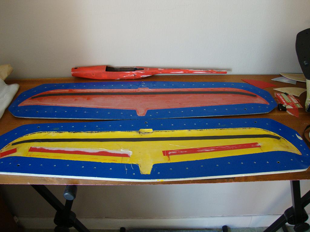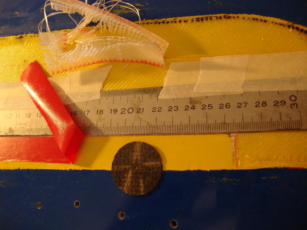 Encima de la pintura he colocado una capa de fibra fina de 50 y encima de ésta, otra de 160 g/m2, con un poco de cinta aislante he tapado la zona del alerón y tambien he marcado en rojo donde irá el larguero.