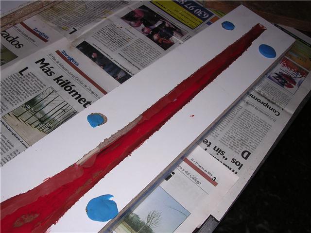 El fuselaje metido en su encofrado, lleva 6 manos de barniz y 2 de pintura roja bien lijado con lija de agua y pulido con pulimento de pintura titanlux y paño de algodón, ha quedado muy suave.
