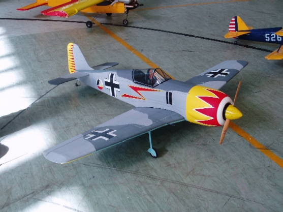 En vuelo parece una maqueta y es realmente bonito verlo volar con su morro amarillo. El modelo es una réplica del que voló un As alemán "Galarlt", o algo así, en 1942 en el frente Occidental (Francia).