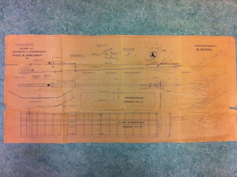 Eso tengo que probarlo, pensé y para las vacaciones de este verano hemos construido uno mi hijo y yo, y en las llanuras de Alvalate de Zorita en Guadalajara en sus térmicas intentaremos volarlo. Como lo que me gusta es hacer aviones antiguos busque en mi coleción de planos y encontre este modelo que solo al ver el color del papel del plano se ve lo viejo que es.