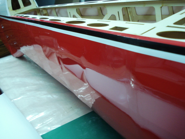 Esta foto es muy aprvechable para que veais de que forma esta construido el fuse del R3, observad las "aguas" en el brillo del entelado y la manera en que esta montado el forro de madera del fuselaje sobre las cuadernas, el aligerado llega a ser obsesivo.