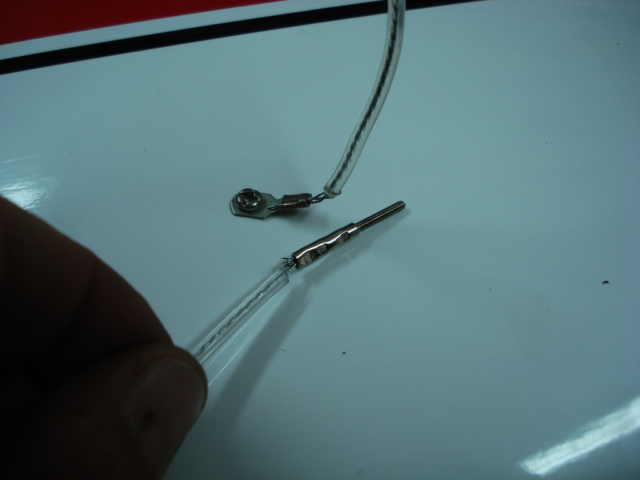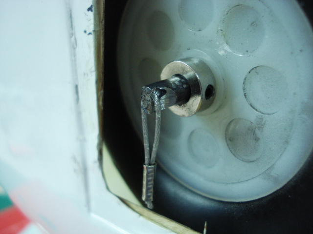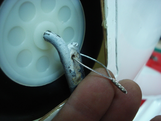 Una vez que hecho el taladro, paso este hilo de acero (del que se utiliza para pesca), este cable se va a encargar de sujetar los kwik-links de los tirantes.