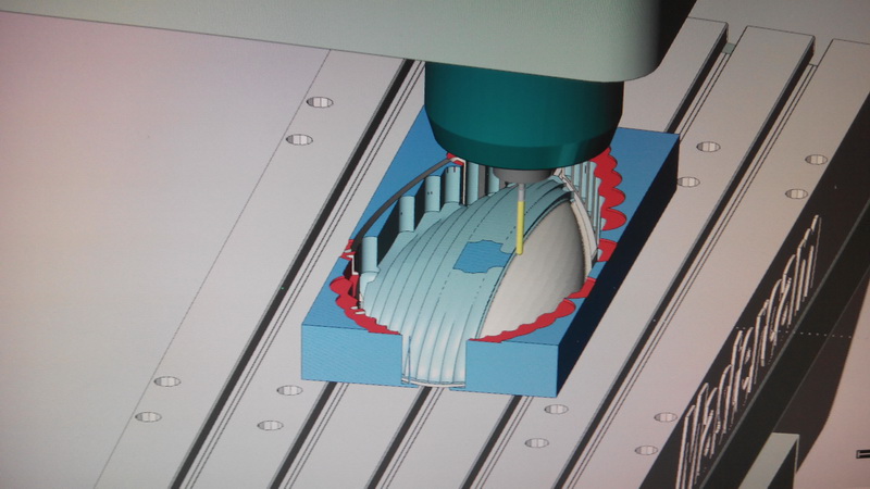 4º acabado con fresa de Ø6mm de punta redonda, con un paso de 0,4mm, mecanizando la masilla plastica que le he aplicado luego del paso 3º