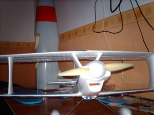 Me sumo a los que dicen que este avion vuela muy bien. Yo lo llevo con un motor de 1150rpv, me consume unos 23 a 25A con una 10x4´7 tipo slowfly, le tuve que lastrar el morro con 6 pilas de las AA para que me diera el centro, (el motor tan solo pesa 80gr y no es suficiente con ese peso) aun asi, y habiendole dado incidencias al motor abajo y a la derecha cuando le meto gas a tope no va derecho, va hacia arriba trepando, con lo cual si paso de medio gas y no quiero que me suba mas pues tengo que andar corrigiendo con profundidad. Una cosa que le he notado es que cuando hago invertidos tengo que corregir bastante con profundidad y que cuando hago un looping cerrado pues no los hace derecho, y el dia del estreno no hacia nada de viento, supongo que sera todo esto por el perfil y el diedro del ala inferior. ¿os pasa a vosotros tambien?