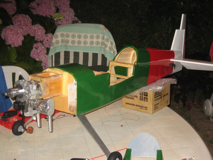 2. Quitarle peso a todo el avión, por increible que parezca pesaba 7,2 KG con medio litro de deposito a sumar y tirado por un Zenoah 38, con una superfície alar de 78 dm2 aun me asombro de haber conseguido torque, estacionario, barrenas planas invertidas y positivas, enfin que para ir sobrepesado volaba la mar de bien.