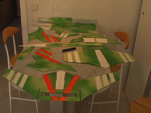 Ya cortadas las piezas, he hecho unos nuevos planos a escala real del modelo definitivo resiguendo sobre papeles pegados con celo las piezas de foam. Así me será más sencillo conseguir recambios o hacer de nuevo el modelo.