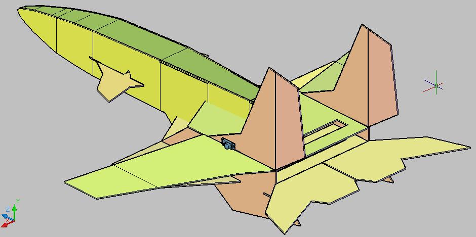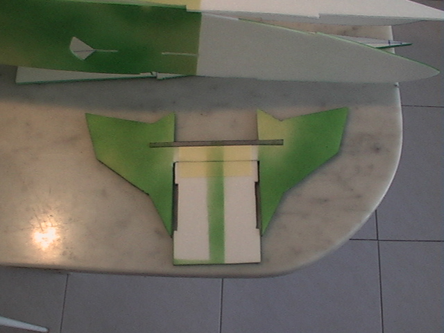 Basándome en este concepto dibuje unos cuantos modelos hasta que di con el "look" que mejor se adaptaba a la imagen mental de lo que quería conseguir así que dibujé unos planos del avión partiendo del dibujo y construí una maqueta de vuelo libre en Depron para comprobar que mi modelo trazaba bien en el aire y no tenia vicios extraños que me diesen que pensar que el intento era un fracaso.