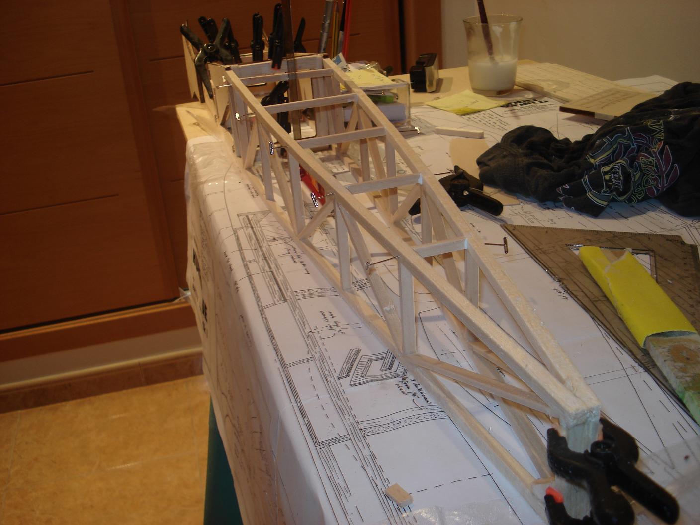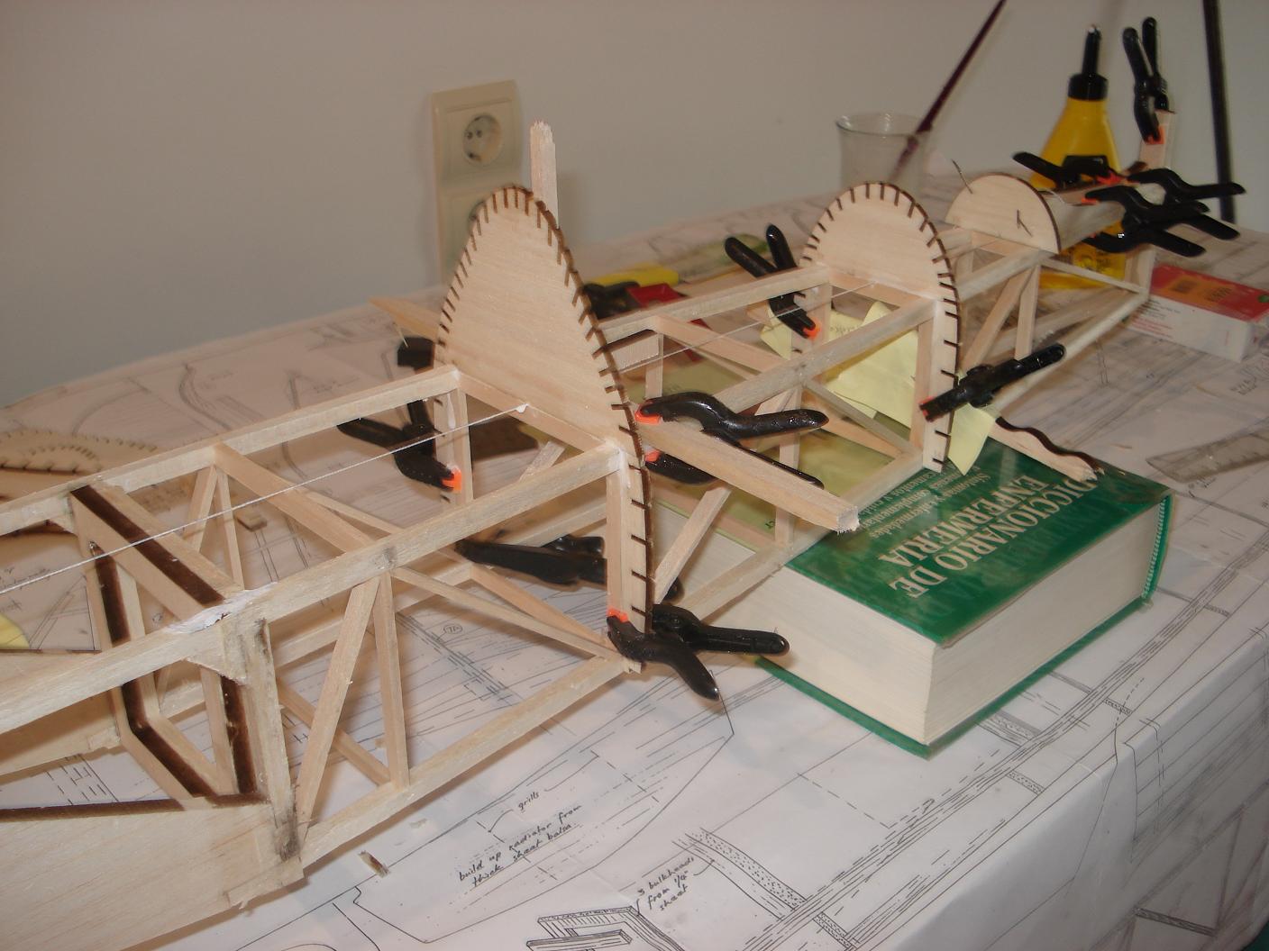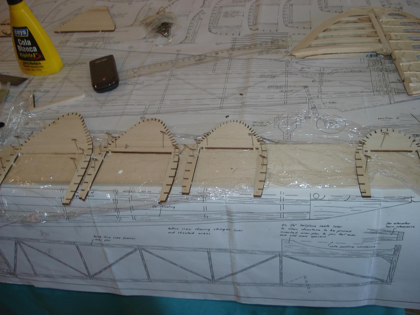 Por las fotos que has puesto veo que estas usando la cola blanca con una prodigalidad digna de quien no ha montado muchos kits de palitos. Con que apliques una línea de cola sobre el borde de las costillas o cuadernas a pegar es más que suficiente, eso de echarle un cordoncillo de pegamento por las esquinas solo aumenta el peso del modelo y no mejora la unión. Yo tengo un primo, el que me metió hace 40 años el gusanillo del aeromodelismo, que tiene la costumbre de rebajar la cola blanca un 40% con agua ya que asegura que pega igual y no mete tanto peso, a fin de cuentas el agua se evapora.
