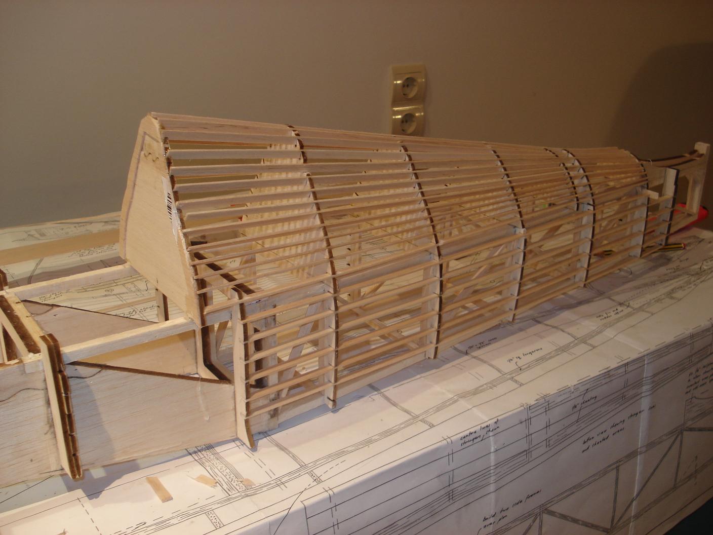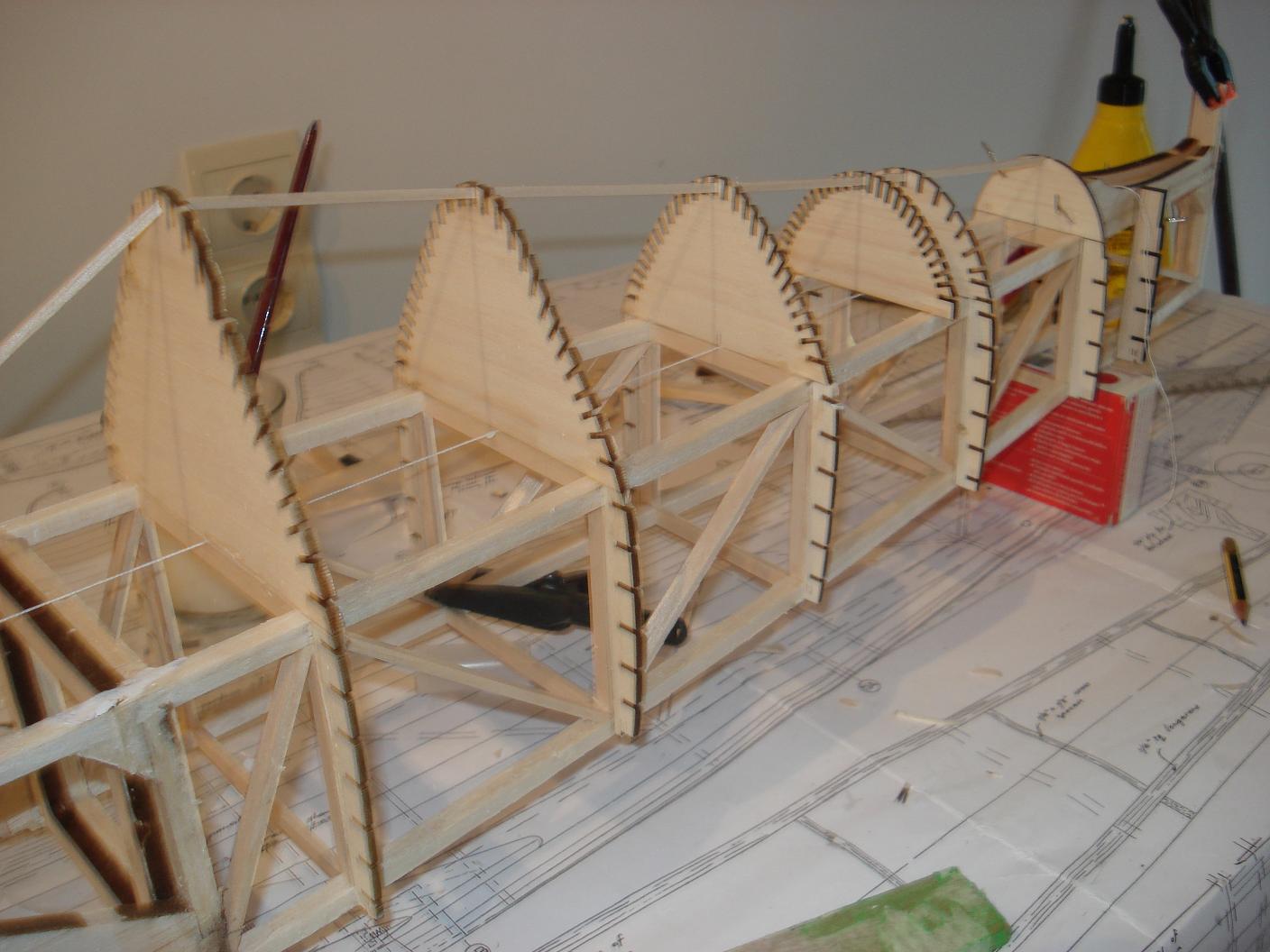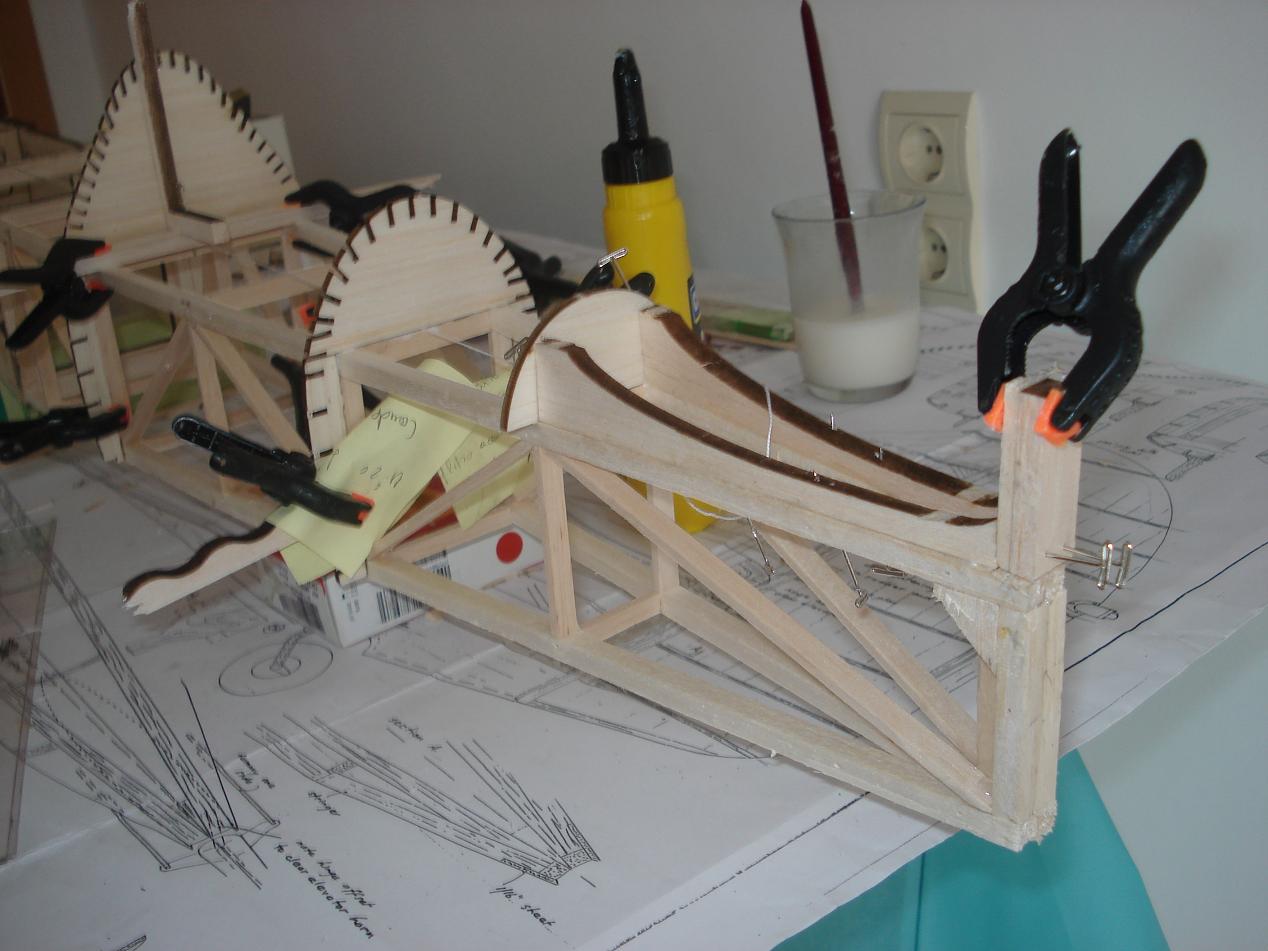 Por las fotos que has puesto veo que estas usando la cola blanca con una prodigalidad digna de quien no ha montado muchos kits de palitos. Con que apliques una línea de cola sobre el borde de las costillas o cuadernas a pegar es más que suficiente, eso de echarle un cordoncillo de pegamento por las esquinas solo aumenta el peso del modelo y no mejora la unión. Yo tengo un primo, el que me metió hace 40 años el gusanillo del aeromodelismo, que tiene la costumbre de rebajar la cola blanca un 40% con agua ya que asegura que pega igual y no mete tanto peso, a fin de cuentas el agua se evapora.