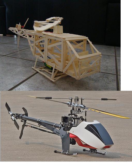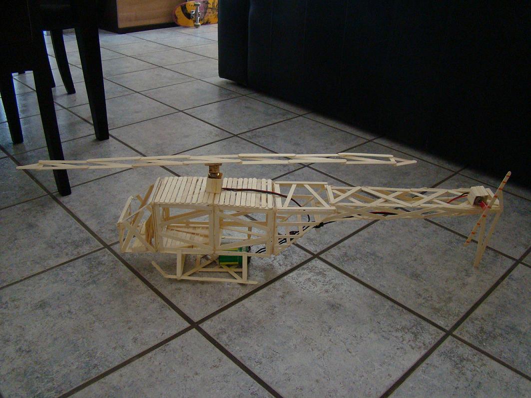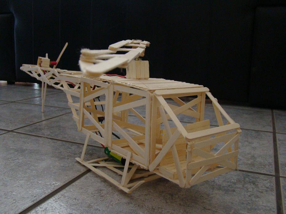 Hola buenas, como sabeis y para los que no lo sepan lo digo, estoy en 2º de eso (tengo 13 años). Bueno, pues hace 3 semanas el profesor de tecnología nos dijo que teniamos que hacer un trabajo con palillos de polos, la mayoría se decantó por lo típico; norias, puentes y estructuras que aguantan peso, pero a mi se me vino a la cabeza la idea de hacer un heli, me lo propuse y poco a poco lo he ido haciendo. He tardado bastante (3 semanas), pero esque solo tenemos 3 clases de tecnología a la semana y tenemos 2 pistolas termofusible para 23 alumnos!!!!! flipadlo.