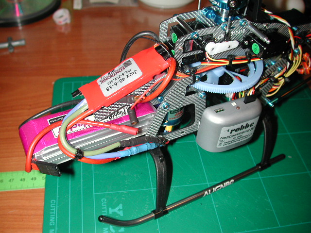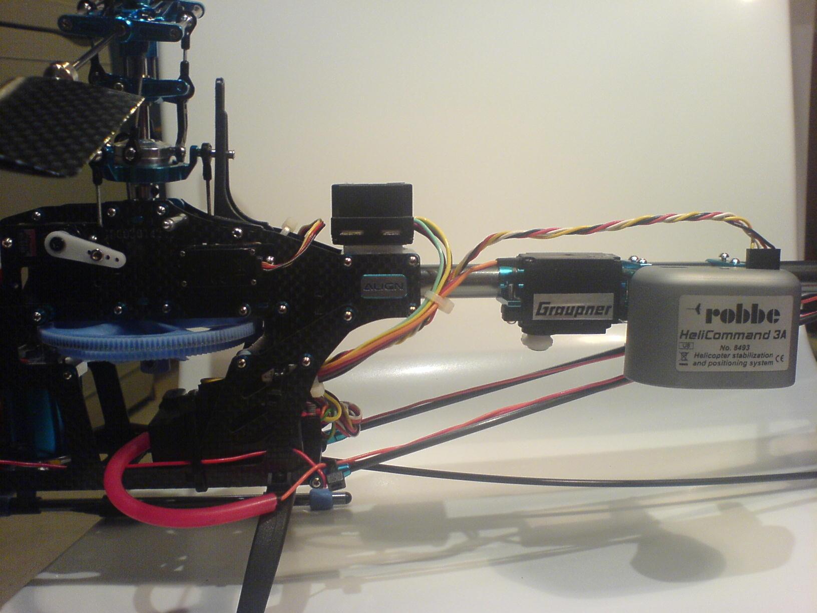 Yo lo puse en el lateral, porque el manual insiste mucho en que es mejor ponerlo lo mas alineado con el el eje del rotor principal (supongo que para que se alinee con el centro de gravedad del heli), tengo que seguir haciendo pruebas, no obstante he visto instalaciones de los dos tipos (lateral y en cola).