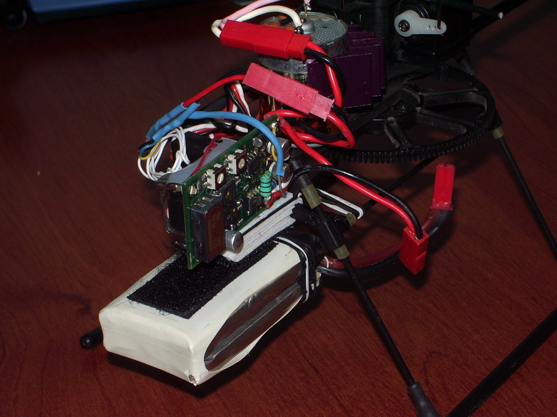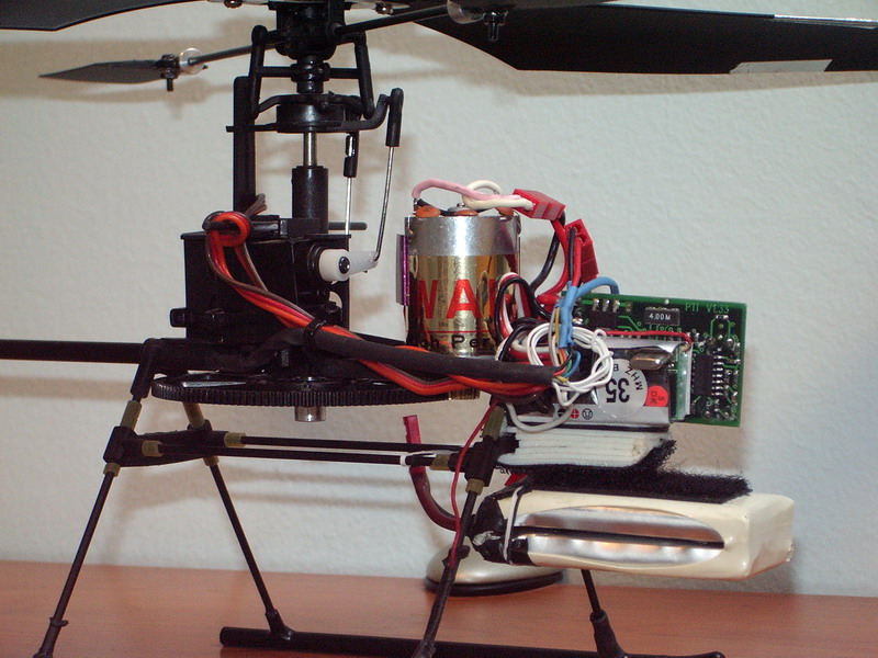 Con todo esto este peazo bichin vuela "de maravilla"(al menos mejor que el aerohawk que jamas consegui volarlo decentemente).Posee un poder de ascension de mas del doble que tal como venia, incluso con las lipos de 2.400mA que pesan lo suyo(mas revoluciones en el rotor principal=mayor control sobre el vuelo), la duracion de las baterias es de unos 20 minutos sin tocar suelo con la lipos de 2.400mA, y de unos 10-15 minutos con las de 1.200mA