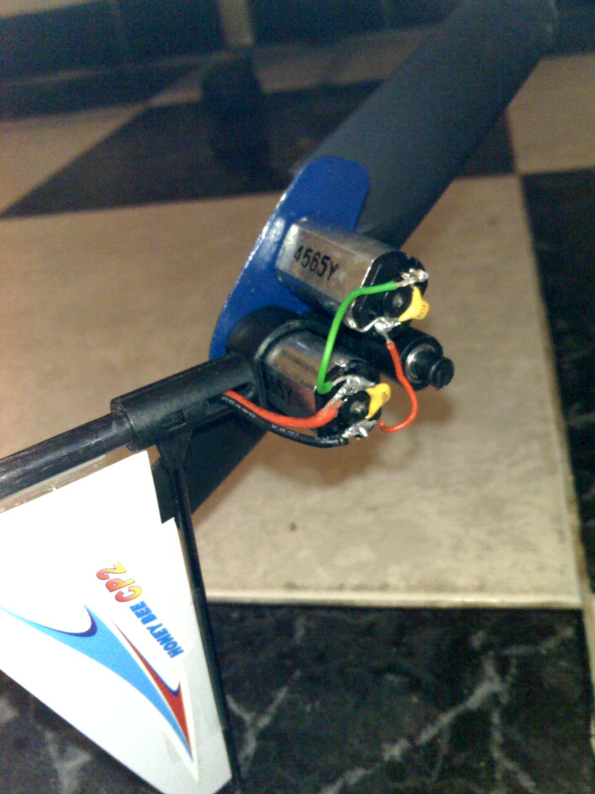 Por fin le puse ayer los dos motores en la cola, le e hecho una pieza en aluminio de 0.8mm y me e inventado la posición que mas me a gustado, en uno de los orificios de los tornillos le hice un poco mas largo para facilitar el montaje y todo listo, lo de los cables no tubo demasiado problema, me surgieron en el montaje un problemilla inesperado que no se si es muy normal.