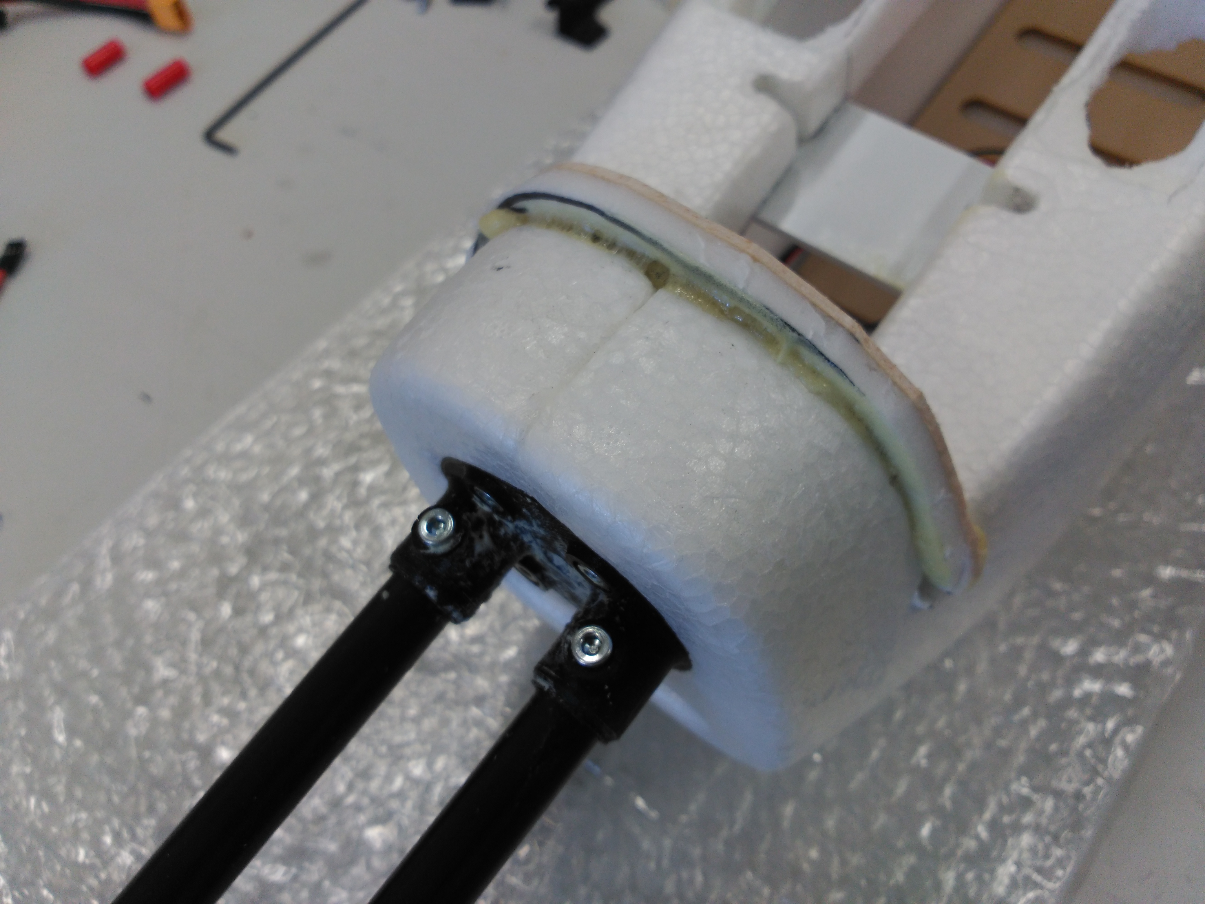 Una vez cerrado el fuselaje pego los piezas de impresión 3D que soportan los tubo de la cola convencional.
