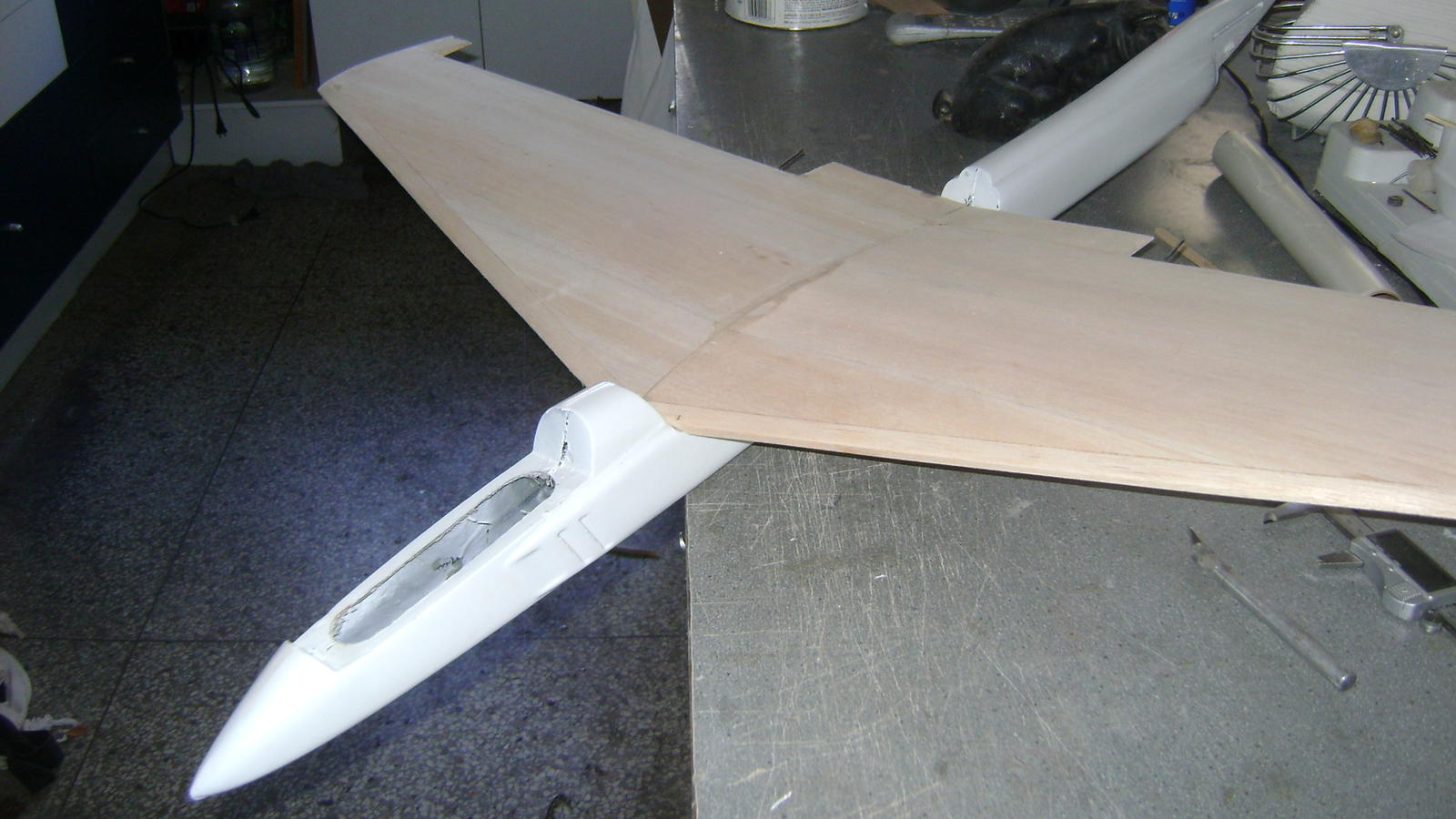 Además y como he comentado con anterioridad, el borde de salida está retorcido hacia abajo como uñas de gavilán.. :shock: y tendré que mojarlo colocarlo sobre el tablero bien plano y colocar los triangulitos de refuerzo como hemos hecho en el BOT y el O2... además por supuesto de un encolado total y enmasillado. El fuselaje lo está pintando un amigo con aerografo y tengo que hacerle una tapa cabina en balsa ya que se perdió la que venía..., en fin que iremos alternando este trabajo con el Mirage. Quiero dejarlo terminado el trabajo en la estructura del ala para lijar esta a la vez que la del Mirage.