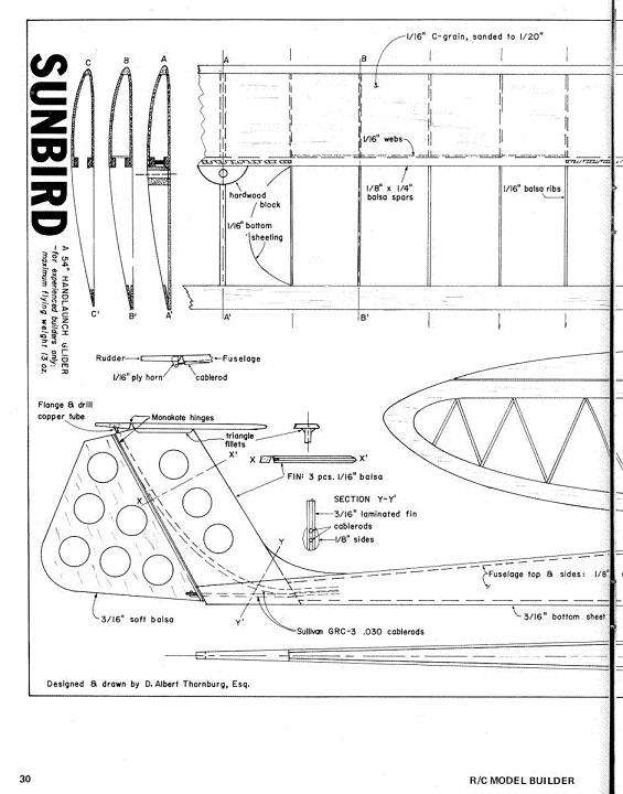 En cuanto a lo que me comentas de meterle mano a un Sunbird ... pues qué quieres que te diga... :) :) :) :) :) que te animo a ello y claro que conozco ese velerito, se trata de un pequeño lanzado a mano del mitico Maestro Mr. David-Albert Thornburg, como bien dices y creo recordar que fué publicado en la revista Model Builder americana de Abril de 1.980. Tiene toda la firma y lineas clásicas que tanto le gustan al amigo Dave, compartiendo esos marginales tipo Hirh Wolf del BOT, pero sin el ala de gaviota. El perfil es el mismo del Pajaro con la característica entrada Philips, aunque no recuerdo a qué espesor, y una relativamente grande cola en T... y apenas 1´37 mts. de envergadura, según palabras de su diseñador lo que pretendía en este velero era hacerlo competitivo para cazar térmicas desde un lanzamiento a mano, unir el mundo del vuelo libre y el radio-control en un modelo y que fuese barato y relativamente facil de construir...