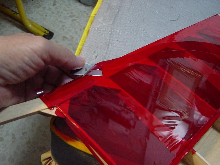 8) En los marginales lo que hacemos es calentar previamente el monokote sin estirar en algunos lugares y acto seguido aplicarlo sobre la madera para que el encogimiento del material se adapte mejor a esta zona de curvas. Por otra parte pegamos las piezas del monokote en todo su contorno sin tensar todavía. Una vez recubierta la semiala completamente es cuando procedemos a ir tensando con cuidado de no producir reviraduras. Para el tensado utilizamos la plancha normal cuidando de no pasar por las uniones ni los cambios de color para evitar que se puedan despegar accidentalmente. Vamos planeando con la plancha por así decirlo como a uno o dos milímetros del monokote, sin llegar a tocarlo físicamente y con el calor aplicado más alto de lo que es normal; pasamos la plancha por una zona de esta manera y seguidamente antes de que se enfríe presionamos el monokote contra la madera con la manopla especial de la Top Flite. De esta manera evitamos en lo posible los característicos rallones de las planchas en los enchapados y nos queda una superficie muchísimo mas lisas... :)