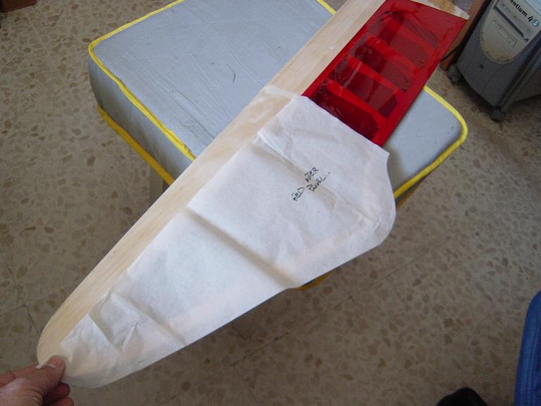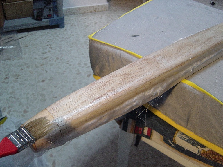 Como ya vamos siendo un poquillo de " perro viejo " :mrgreen: :mrgreen: :mrgreen: :mrgreen: y no tenemos a mano epoxy de laminar pues nos apañamos con epoxy de 30 minutos de secado diluído con alcohol al cincuenta por ciento, que si andamos con prestitud nos puede valer perfectamente. Con una brocha damos una capa a la zona en donde vamos a colocar la tela, colocamos esta bien tensa y acto seguido damos otra capa. Otro truquillo que me gusta mostraros en esto del reforzado es la utilización de papel higiénico... :) :) :) :) :) Es relativamente habitual que nos pasemos en la aplicación del epoxy y ello trae consigo mas tarde un peso extra innecesario y mas lijados. Una solución es extender el rollo de papel sobre la zona de aplicación del epoxy mientras presionamos para que el papel se empape con el epoxy y luego retiramos con cuidado el mismo. Repetimos esta operación un par de veces si fuese necesario y habremos conseguido un laminado con una superficie ya relativamente lisa y con el epoxy justo para efecutar su misión. Esta tecnica es muy utilizada en las maquetas sobre todo de los cazas warbirds con alas y fuses totalmente enchapados como fase previa al pintado... :)
