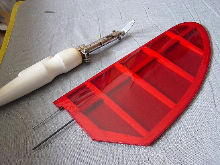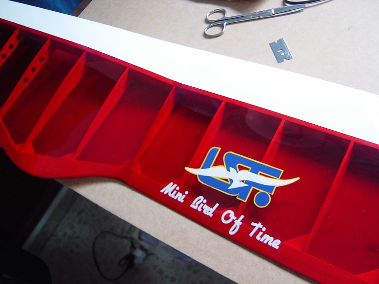 8) Y volviendo a la guarida hemos terminado de forrar la zona roja transparente de la otra semiala y uno de los semiestabilizadores horizontales del Mini Bird Of Time. Hay que tener especial cuidado en no revirar la estructura y aplicar el calor justo para tensar el monokote sin mas haciendolo por ambos lados a la vez del estabilo y comprobando continuamente que estén bien rectos los bordes de ataque y fuga... :)