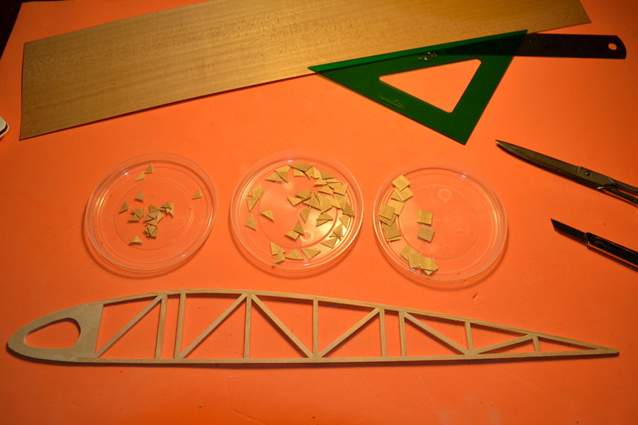 Los materiales para cada costilla (en total son 42), son CONTRACHAPADO de 3mm para el los bordes de ataque y listones de PINO de 3x3mm para la estructura de cada costilla. Además, irán reforzadas con contrachapado de 0,4 en cada unión.