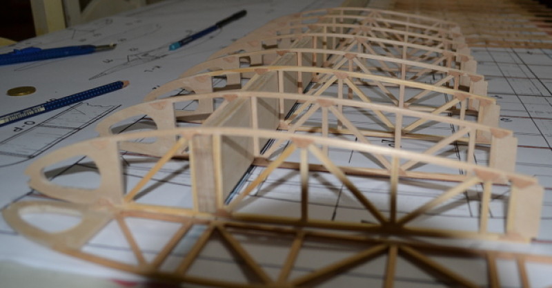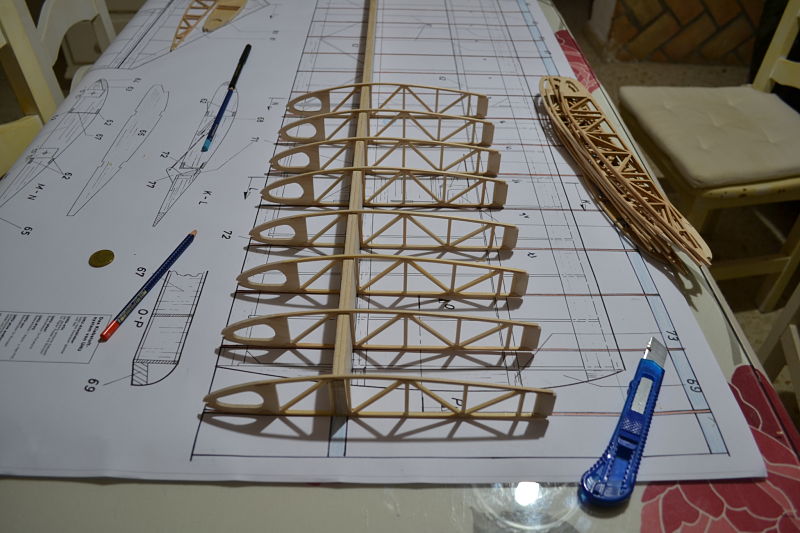 espero que no hayas cortado todavia todos los frentes de costillas :oops: , creo que con el contrachapado finlandes de 3 mm es como matar moscas a cañonazos, podrias pasar con el contrachapado barato de ocume de 3 mm ya que no es una estructura que vaya a soportar pesos o tensiones extremas, ademas ahorrarias peso, de los refuerzos de las triangulaciones de las costillas, en vez de contrachapado bueno de 0,4 mm podrias usar recortes de ocume de rechapar con tal de que pegues las piezas con la veta cruzada al esfuerzo.