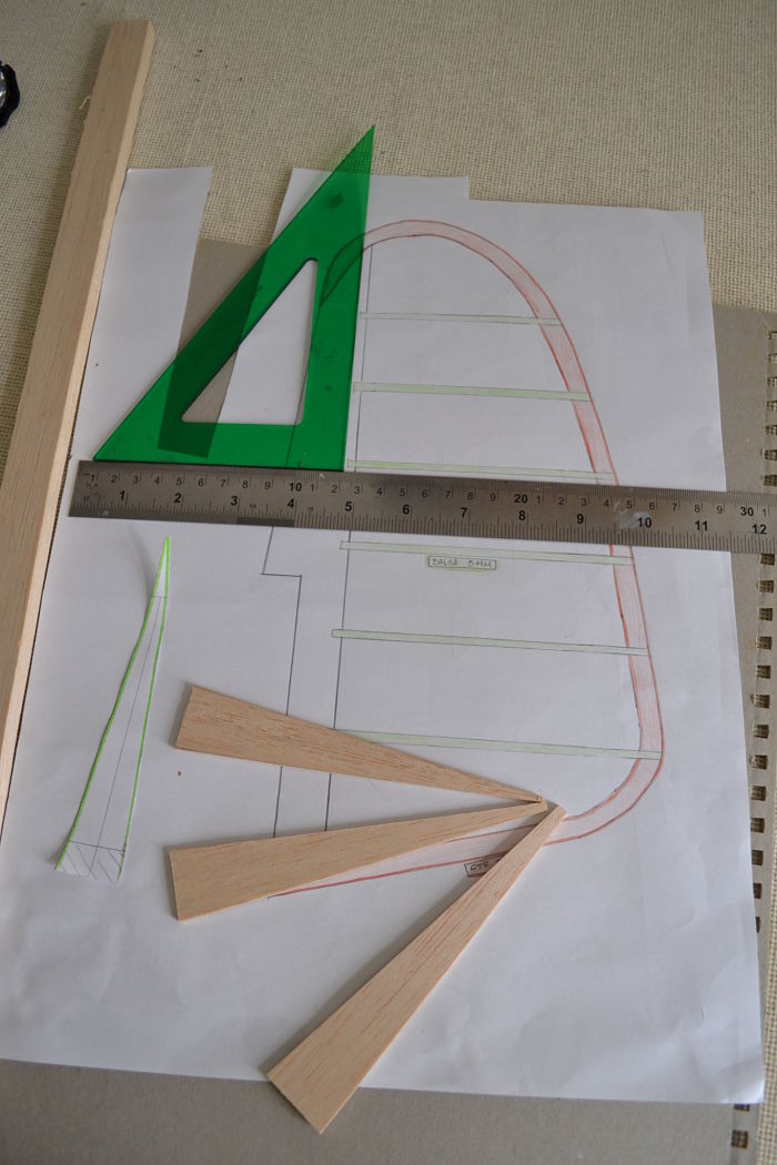 Las costillas de la deriva irán en balsa de 3mm, en plano vienen encastradas directamente en la balsa, yo voy a intentar hacer que pase un contrachapado de 0,6 entre ellas, y este forrado con balsa, ya lo ireis viendo