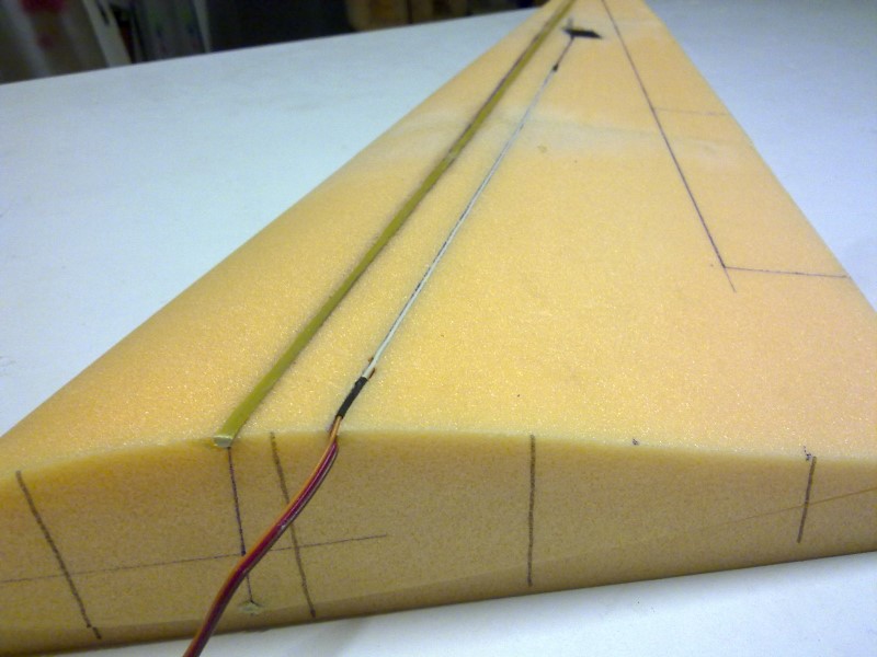 Ta tengo preparados los cajeados para los servos de los elevones, porque flaps no va a llevar. Los servos de los elevones se sitúan en la mitad del elevón, como no podía ser de otra manera. Así se gana en precisión de mando al reducirse las torsiones de la superficie de mando.