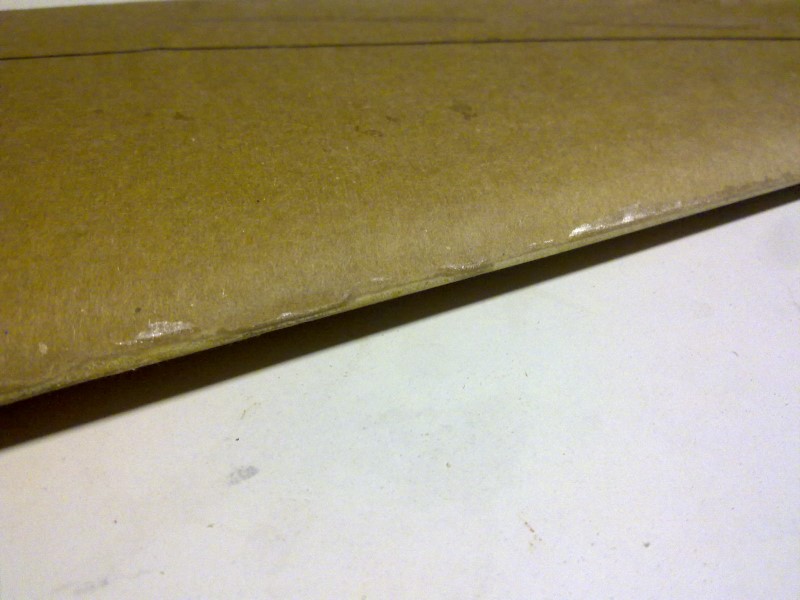 Al final lo hice yo solo y sin borde de ataque en balsa. Al lijar el sobrante, aparecieron algunas imperfecciones, ya que el vacío no consigue cerrar completamente. No pasa nada y es normal, se lija como si nada y aunque quede un poco separado se vuelve a aplicar cola de poliuretano y vuelta al vacío. Esta vez lo tendrá más fácil :D . Una vez fuera del saco, se vuelve a repasar con la lija y ya está.