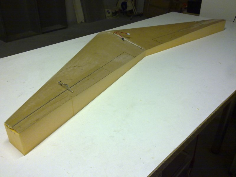 Ya está prácticamente listo. Quedan pocos detalles: los marginales, fijar batería y receptor y no sé si reforzar la unión de las semialas. El conjunto ha quedado muy sólido pese a que las semialas sólo están pegadas con cola de poliuretano, no hay largueros de unión ni tampoco tejido de fibra. Puede que le ponga alguna mecha de refuerzo.